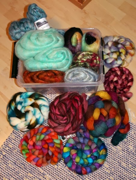 Year 2014 is on go and there has been silent in blog this far. The silence has some explanations. Once again I have discussed with me myself and I about reasons for this blog and I've thought that I can close this down, but at least here I am now. And then there has been quite few things to blog about. And for third thing, I've changed work place and that has been in my mind more than hand crafts. - So, last year my goal was to make 12 shawls and I did that, in fact I made more than twelve of them, so that's all about last year, goal completed. This year I won't make twelve shawls I know, even if those are lovely to make in general. But I need to aim at something, and this year I try to finish 14 projects in which I use my handspun yarns. What kind of projects those will be the time will tell. The other goal is to spin the fibers in box in picture below into yarns. So, that's some goal for a working mom I think...